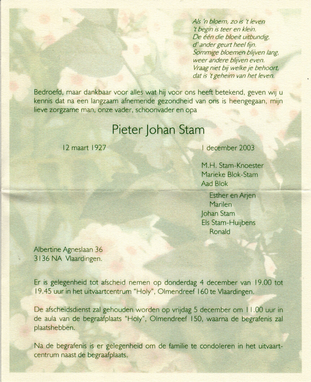 2003-12-01 rouwkaart Pieter Johan Stam
